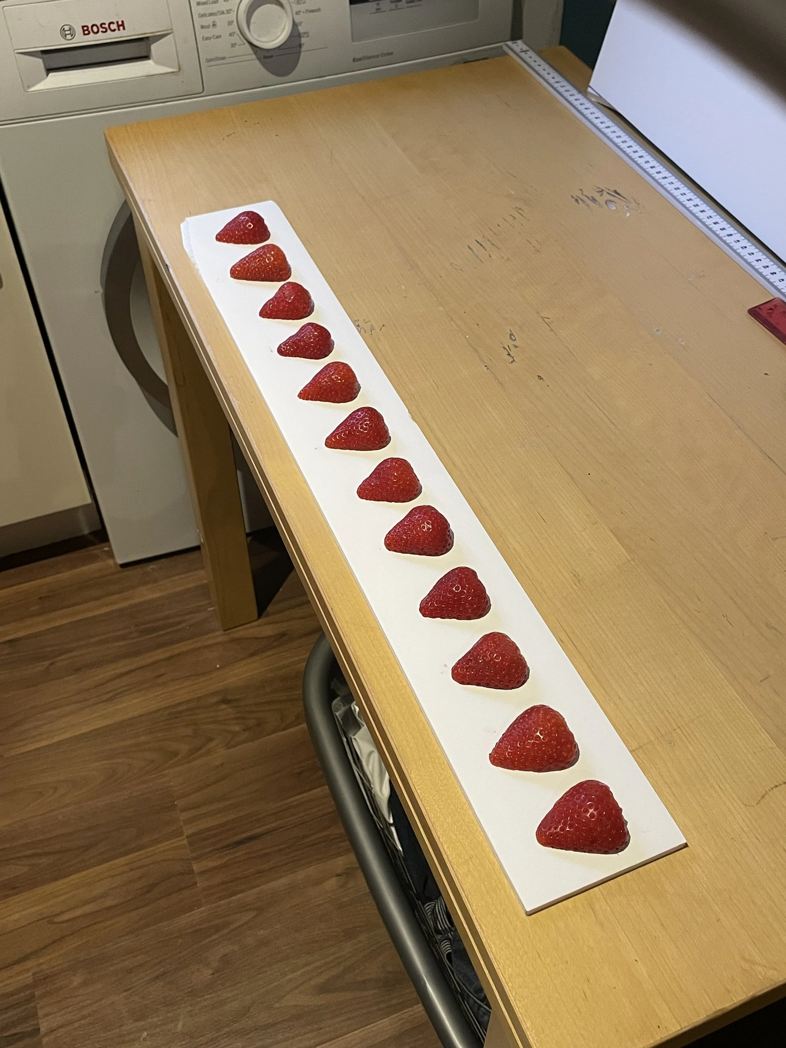 Plaster casts of real strawberries were taken using an alginate mould. Casting several strawberries at once made the process faster as well as giving natural variety to the shapes and sizes.