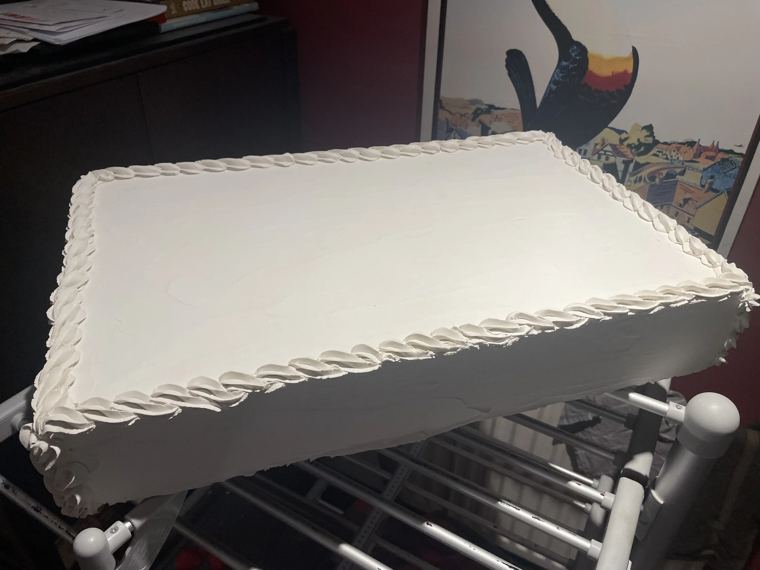 The reference image I was provided showed a large, rectangular, white cake with decorative piped icing on all corners and additional piped decoration on the top with a border of fresh strawberries. The structure, decorative corner icing and strawberries were what I was asked to replicate.